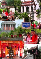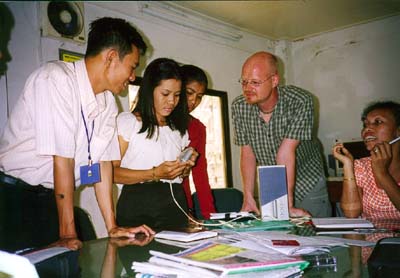 Gueterzug oder Personenzug? Puenktlich um acht Uhr fuhren wir ab. Das Schaukeln der Haengematte brachte mich auf die Idee, doch noch ein "Reisegold" einzuwerfen, was sich als formidable Idee erwies. Denn nachdem sich der Zug einige Kilometer durch die Landschaft geschlaengelt hatte, dockte ploetzlich eine Art von einem Motorroller betriebene Draisine hinten an und durch Oeffnungen in der Rueckwand wurde Holz aufgeladen. Zu diesem Zwecke mussten die auf dem Boden hockenden Passagiere hin und her springen und auch wir verliessen auf Kommando des Ober-Holzverladers unsere Haengematten. Ich lege meine Haende nicht dafuer ins Feuer, dass der Herr wusste, was er da tat. Als die Aktion Holz beendet schien und sich die Menschen auf dem Holzstapel verteilt hatten, waren ploetzlich wieder harsche Kommandos zu hoeren, denn nun musste bei fahrendem Zug das Holz noch aufs Dach verladen werden. Sechs Stunden... 29.10.02 Medienmenschen in Phnom Penh Heute war quasi ein Arbeitstag. Rainer hatte die Aufgabe, den Mitarbeiterinnen von Susanne zu erklaeren, wie man ein Interview mit dem MD-Recorder macht. Nicht ganz leicht, sich in ihre Denke hinein zu versetzen, wenn man selber ein alter Hase in der Branche ist. Aber es hat geklappt - und ob die Information, dass man im Interview zustimmende Kommentare besser nicht abgegeben sollte, angekommen ist, werden wir demnaechst im kambodschanischen Radio hoeren koennen. Am Nachmittag haben wir dem National Radio dann einen kleinen "Arbeitsbesuch" abgestattet. Das Equipment dort ist noch recht altertuemlich und die Studios bei Radio Hamburg sind bestimmt auch etwas repraesentativer eingerichtet. Was dort gesendet wird, wird vorher komplett aufgezeichnet. Und das Okay der Regierung braucht man nur, wenn man eine politische Nachricht senden moechte. Da das etwas dauert, koennt Ihr Euch vorstellen, wie aktuell die Sendungen sind. Aktuell auch deshalb, weil eine beliebte Quelle fuer die News die lokalen Zeitungen sind. Ich war beeindruckt, wie offen der Kollege dort mit uns gesprochen hat. Parallelen Im Anschluss waren wir im Tuol-Sleng-Museum, dem ehemaligen Konzentrationslager, in dem Pol Pot von 1975 bis 1979 an die 20.000 Menschen bestialisch gequaelt und ermordet hat. Was wir bisher nicht wussten: Die Vollstrecker waren Kinder! Die Frau, die uns durch das Museum gefuehrt hat, hat so ganz nebenbei erwaehnt, dass auch einige ihrer Familenmitglieder in den Reisfeldern gestorben sind. Vielleicht ist das ihre Art, mit der Vergangenheit zurecht zu kommen. Wir waren sehr beeindruckt und haben als Deutsche die grausamen Bilder natuerlich mit ganz speziellen Augen gesehen. posted by darja lena | 18:18Reisefieber Nun sind wir seit vier Tagen in Phnom Penh aber von Kulturschock, Mekong und Meditationen muessen wir spaeter berichten, denn es ist wirklich nicht leicht, hier irgend etwas ins Internet zu stellen. Da der Koenig Geburtstag hat und hier alle frei haben, sind auch wir die naechsten Tage auf Reisen. Erstmal geht es ans Meer nach Sihanoukville (ganz unten auf der Karte - Sueden nennt man das wohl). Bis dahin alles Gute. posted by darja lena | 18:5126.10.02 War's der Drache oder ein Vulkan? Mehr als 3.000 kleine Inseln oder besser gesagt riesige Felsen, bewachsen mit allerlei Gruenzeug, in smaragdgruenem Wasser: das ist die Halong-Bucht im Golf von Tonkin. Etwa 120 Kilometer oder 4 Stunden Busfahrt entfernt von Hanoi. Auf nach Phnom Penh oder: Wie war Vietnam? Vietnam ist in Asien. Asien ist Stille - dachte ich als Asien-Unerfahrene bisher (ha ha, weit gefehlt!). Meine Erwartungen an dieses Land waren gepraegt vom Vietnam-Krieg (der hier Amerika-Krieg heisst), Sozialismus, Bilder von Arbeitern in Reisfeldern, Fernsehdokumentationen und den Fotos von Rainers Trip nach Vietam vor drei Jahren. Dass Vietnam eines der aermsten Laender der Welt sein soll, konnten wir gar nicht glauben. Auf der Fahrt mit dem Zug sahen wir viele Menschen, die die Felder bestellten. Aber waren es ihre eigenen? Wir hatten den Eindruck von Fruchtbarkeit und konnten uns nicht vorstellen, dass in diesem Land Menschen Hunger leiden koennten. Die Kehrseite waren kleine ueberdachte Unterkuenfte am Strassenrand, in denen Menschen, die schwer arbeiteten, schlafen mussten. Sozialismus oder Hardcore-Kapitalismus? Wie kann in einer Sozialistischen Republik auf den Strassen nur so viel so viel Kapitalismus herrschen? Ueberall versuchte man, uns etwas zu verkaufen oder uns in Restaurants zu zerren, so dass wir kaum ein Unterschied zu Aegypten feststellen konnten. Selbst die H'Mongs in Sapa beherrschen eine eher offensive Verkaufsstrategie, mit der sie die Touristen belagern. Von denen gibt es hier uebrigens viele. Tourismus und Floating Villages Vietnam ist ein ausgesprochenes Reiseland. In dieser Hinsicht ist es im Aufbau begriffen und wir glaube, dass hier dieselben Fehler gemacht werden, wie in Europa. Welcher Asien-Tourist will hier schon ein zweites Los Christianos vorfinden? Auf Cat Ba Island ist der Bau von Hotelkomplexen schon sehr weit fortgeschritten. Ein Blick in die oertliche Diskothek zeigte uns ausgelassen tanzende Touristinnen, aber natuerlich keine Einheimischen. Diese schliefen naemlich derweil auf ihren kleinen Booten in schwimmenden Doerfern, die im Hafen oder etwas weiter vor der Kueste lagen. Ein Trip nach Vietnam ist weit weniger Abenteuer, als man denken mag, denn hier ist alles gut organisiert und wenn wir mal vermisst werden: Einfach beim Staat anrufen, die wissen immer, wo wir gerade stecken. Denn wo wir auch sind, muessen wir unsere Paesse abgeben. posted by darja lena | 10:26 Was ist hier sonst noch anders in Vietnam? Ein kurzer Ueberblick... - Asiaten haben laengere Archilles-Sehnen und koennen stundenlang auf flachen Fuessen, der Hintern schwebt knapp ueber dem Boden, in der Hocke am Strassenrand sitzen. Versuchen Sie es mal selbst, wir koennen das nicht, ausser Sie sind Asiate. 22.10.02 Kinder Als wir auf dem Pariser Flughafen in den Flieger nach Hanoi umstiegen, sahen Rainer u